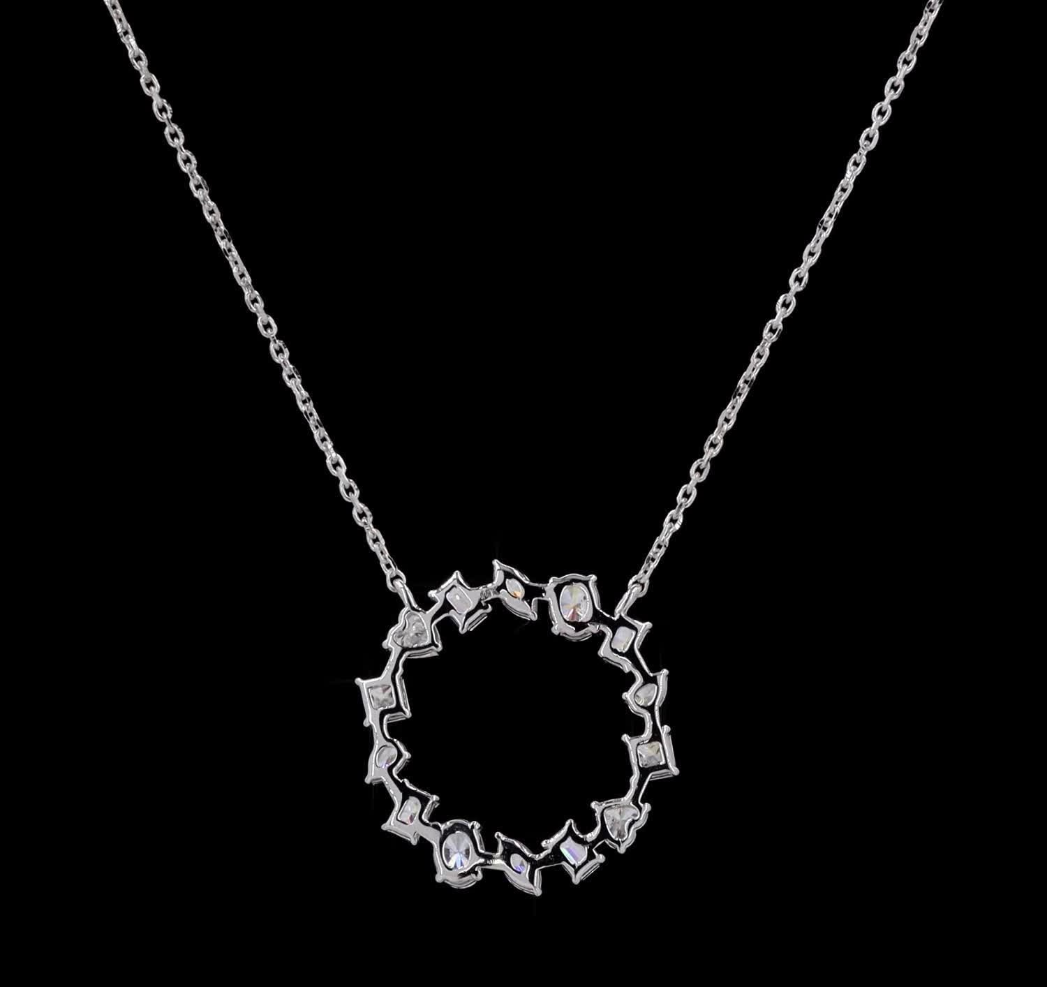 Exquisite 18k white gold necklace featuring a circle pendant adorned with an array of diamond shapes: pear, marquise, emerald, radiant, heart, and princess. Each diamond is hand-set to maximize brilliance and elegance, creating a timeless statement piece.